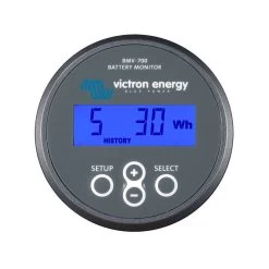 ContrĂ´leur BMV 700 VICTRON permettant de calculer la consommation ampères-heures et l’Ă©tat de charge de la batterie.